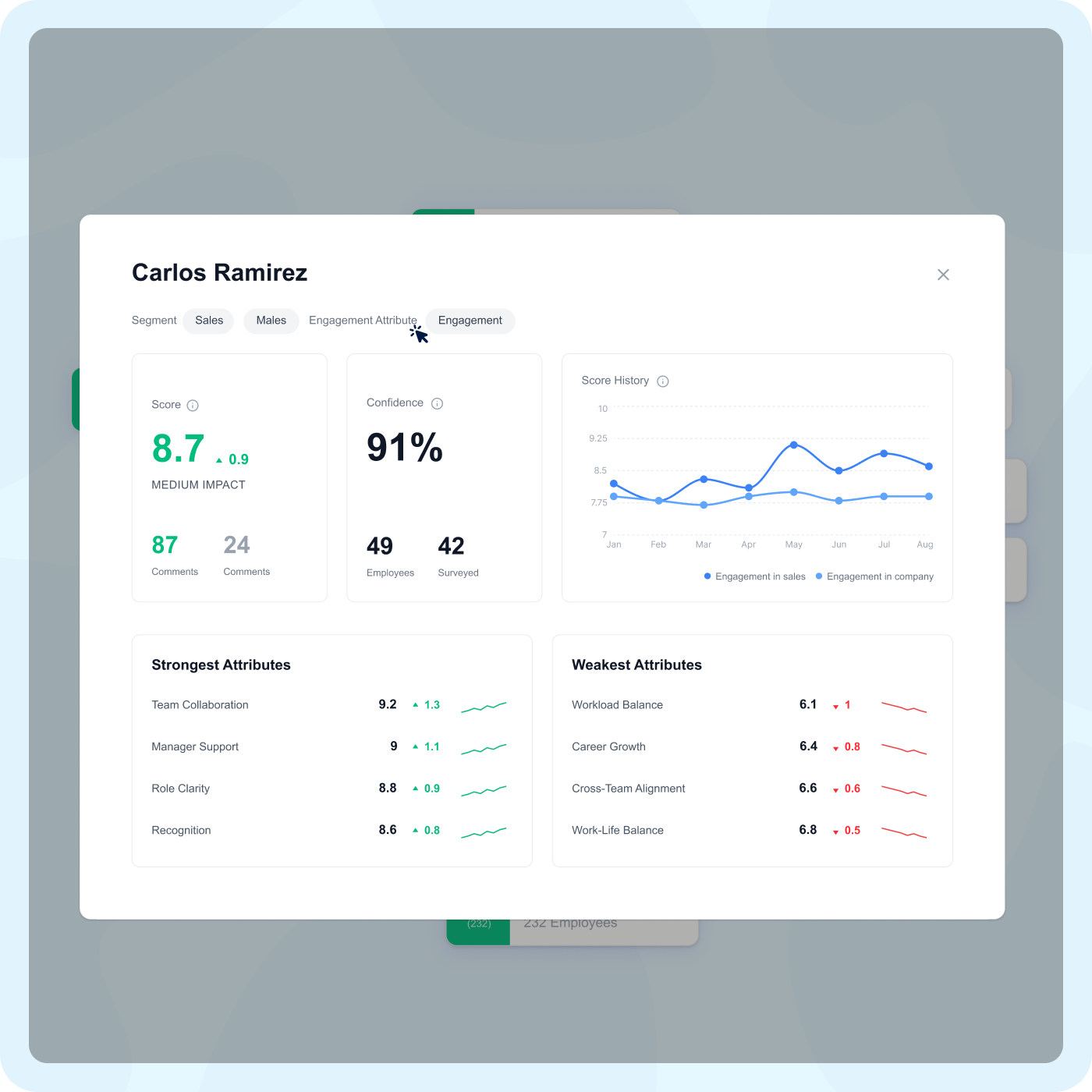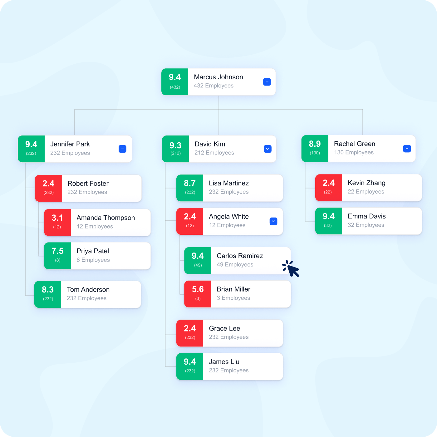 يُمكنك بكل سهولة تتبّع أداء الموظّفين ونسب اندماجهم عبر الأقسام المختلفة داخل المؤسسة، مع إمكانية تصنيف النتائج حسب القسم، أو المدير المباشر، أو غيرها، مما يساعدك على تحسين أداء الفرق وتقليل خسارة الكفاءات.